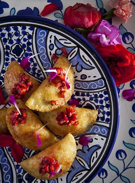 Fold pancake in half to create a ½ moon shape, crimp the pancake with a fluted cutter;